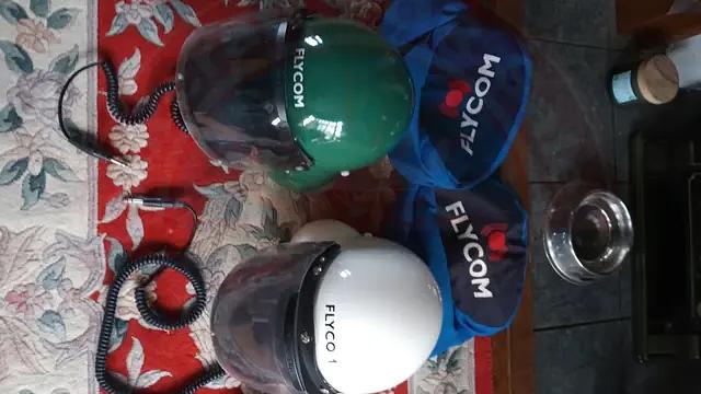 2 Flycom helmets - 1 green, 1 White both medium